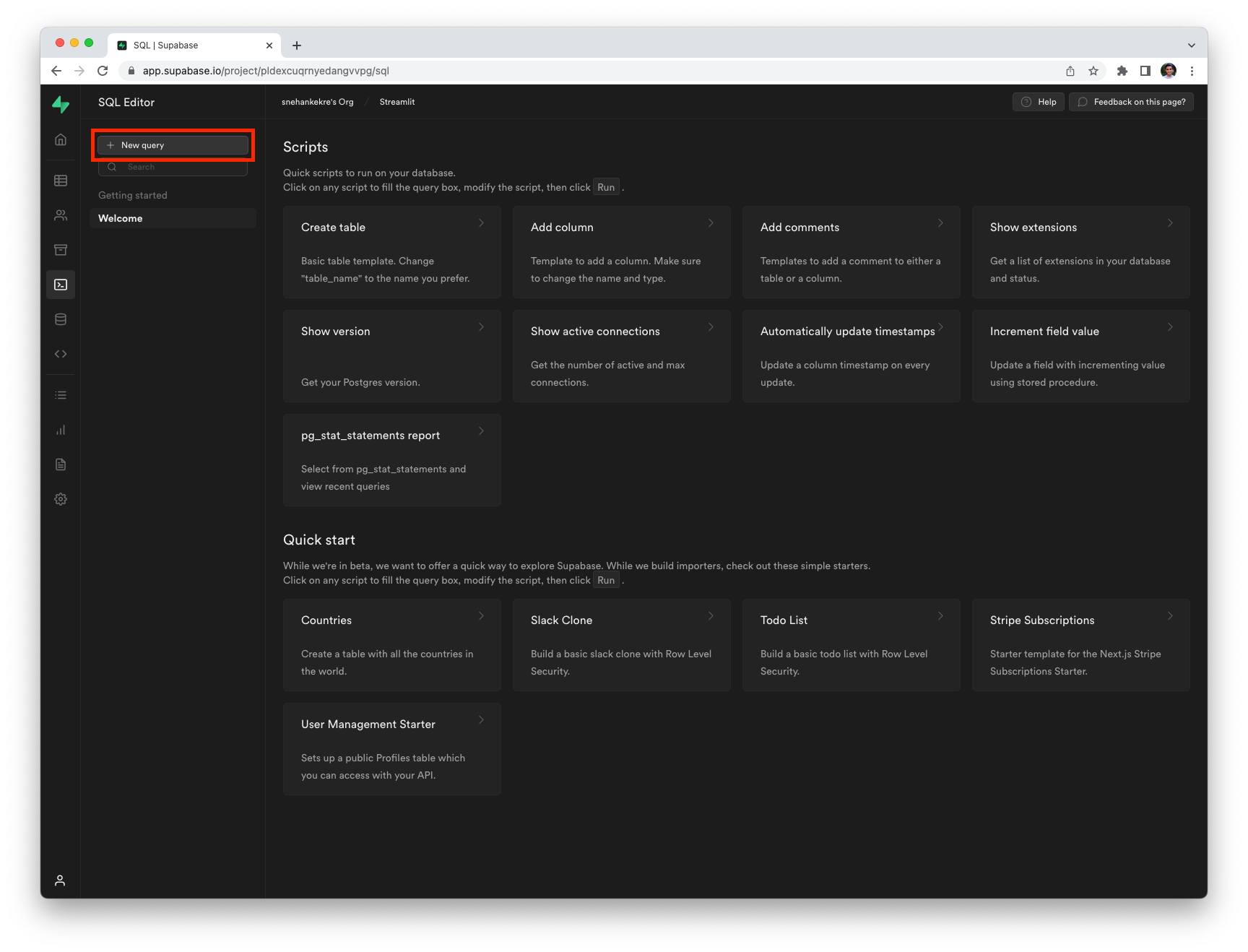 Now that you have a project, you can create a database and populate it with some sample data. To do so, click on the SQL editor button on the same project page, followed by the New query button in the SQL editor.