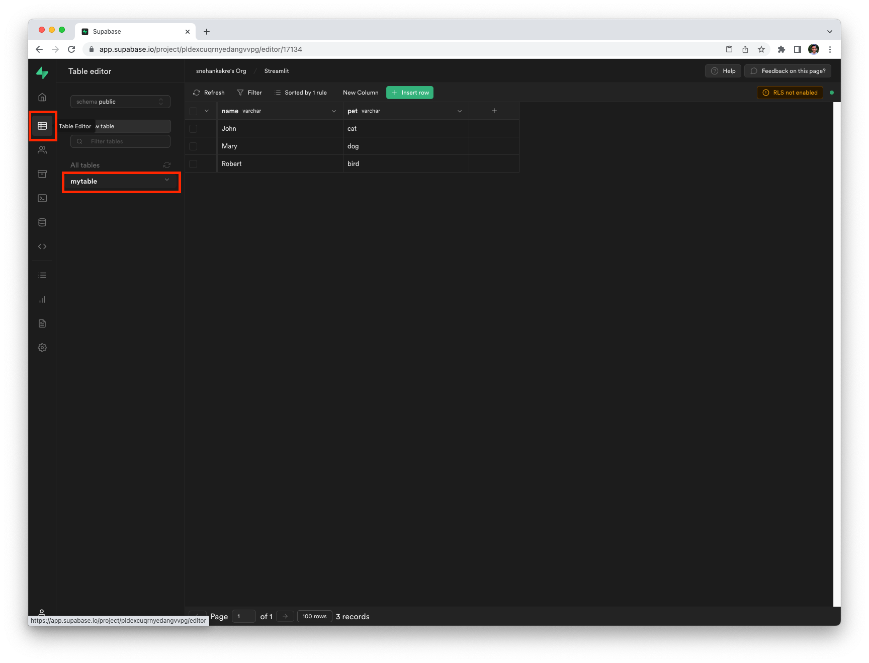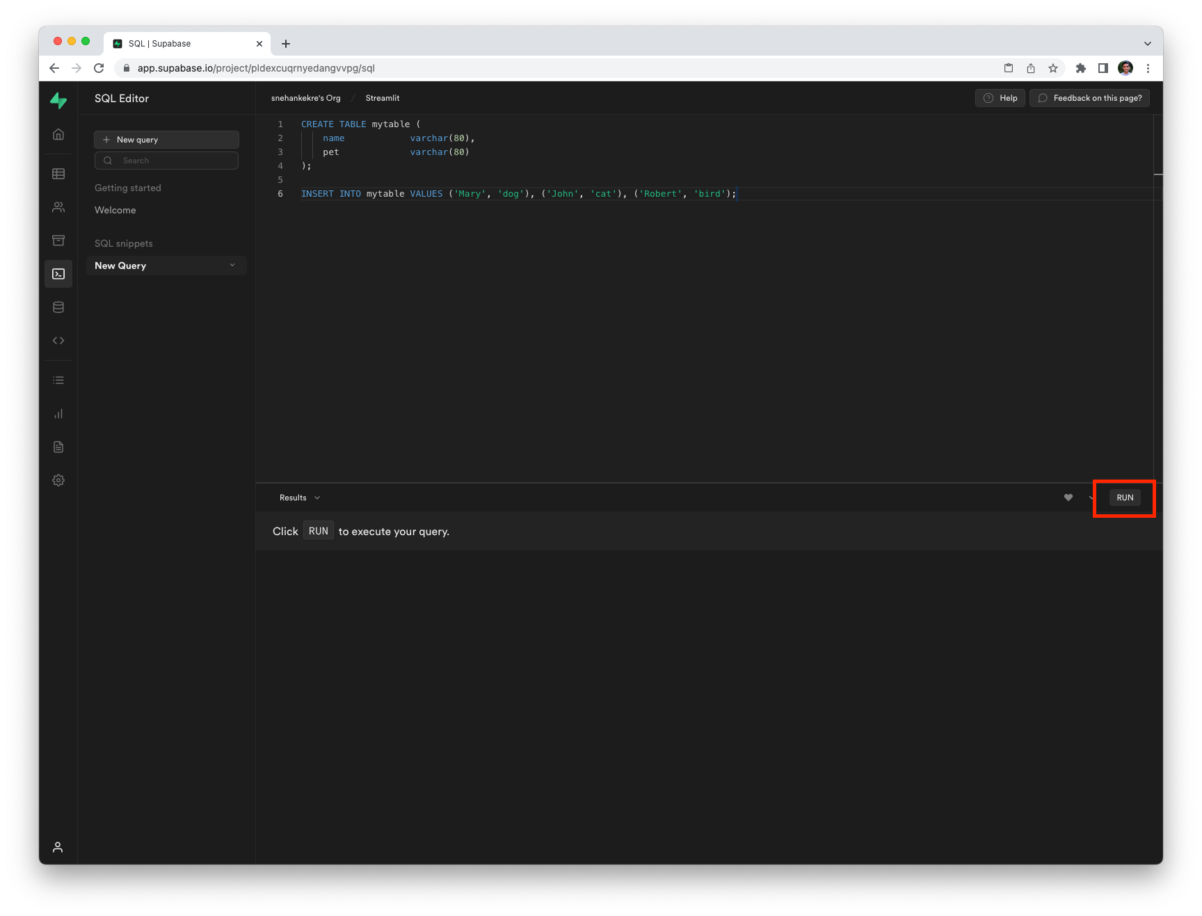 Click Run to execute the queries. To verify that the queries were executed successfully, click on the Table Editor button on the left menu, followed by your newly created table mytable.